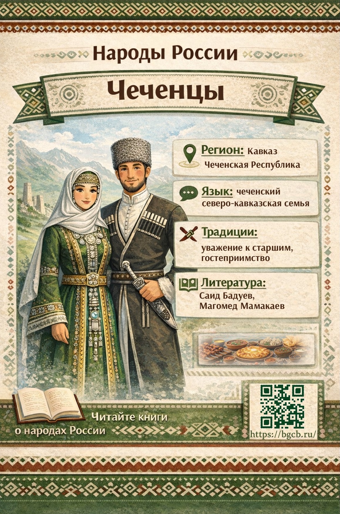 Чеченский народ — неотъемлемая часть многонациональной России. Их история — это пример невероятной выносливости, верности своим корням и активного участия в жизни страны на протяжении веков. Сегодня представители чеченского народа вносят огромный вклад в развитие науки, спорта, искусства и обеспечения безопасности нашей страны. Это народ с сильным характером и глубоким чувством патриотизма. Уважение к их традициям — это уважение к силе России! Хотите узнать больше о народах России и их традициях — приходите в городские библиотеки!