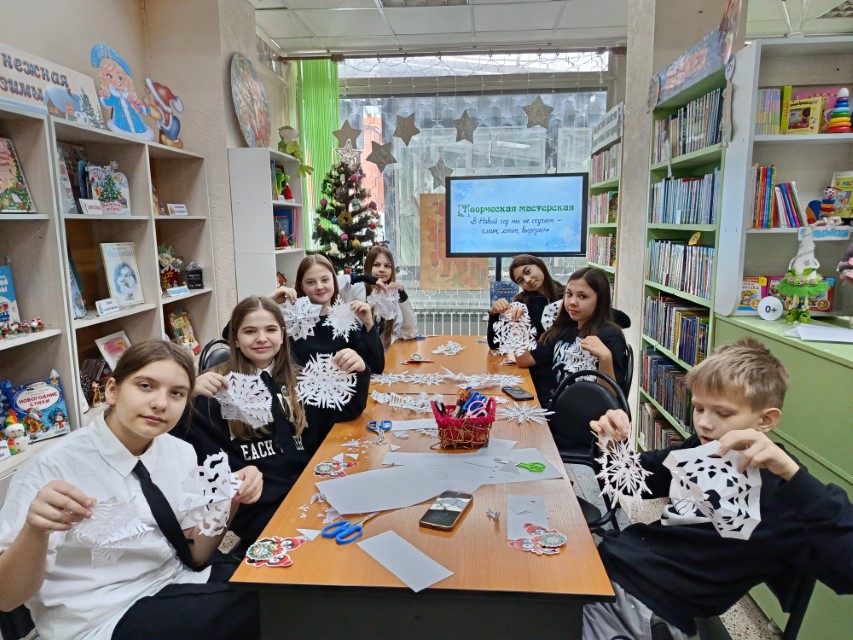 В преддверии новогодних праздников сотрудники библиотеки организовали для своих читателей творческую мастерскую «В Новый год мы не скучаем – клеим, лепим, вырезаем». На этом мероприятии участники смогли узнать о происхождении искусства вырезания снежинок из бумаги, а также познакомились с книгой В.В. Серова и В.Ю. Серова «Вырезаем снежинки». Ребята не только слушали интересные факты, но и получили возможность самостоятельно создавать удивительные