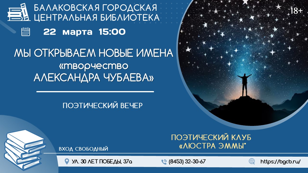 22 марта в 15:00 в зале информации городской центральной библиотеки состоится литературный вечер, посвященный творчеству поэта, участника поэтического клуба «Люстра Эммы» Александра Николаевича Чубаева.