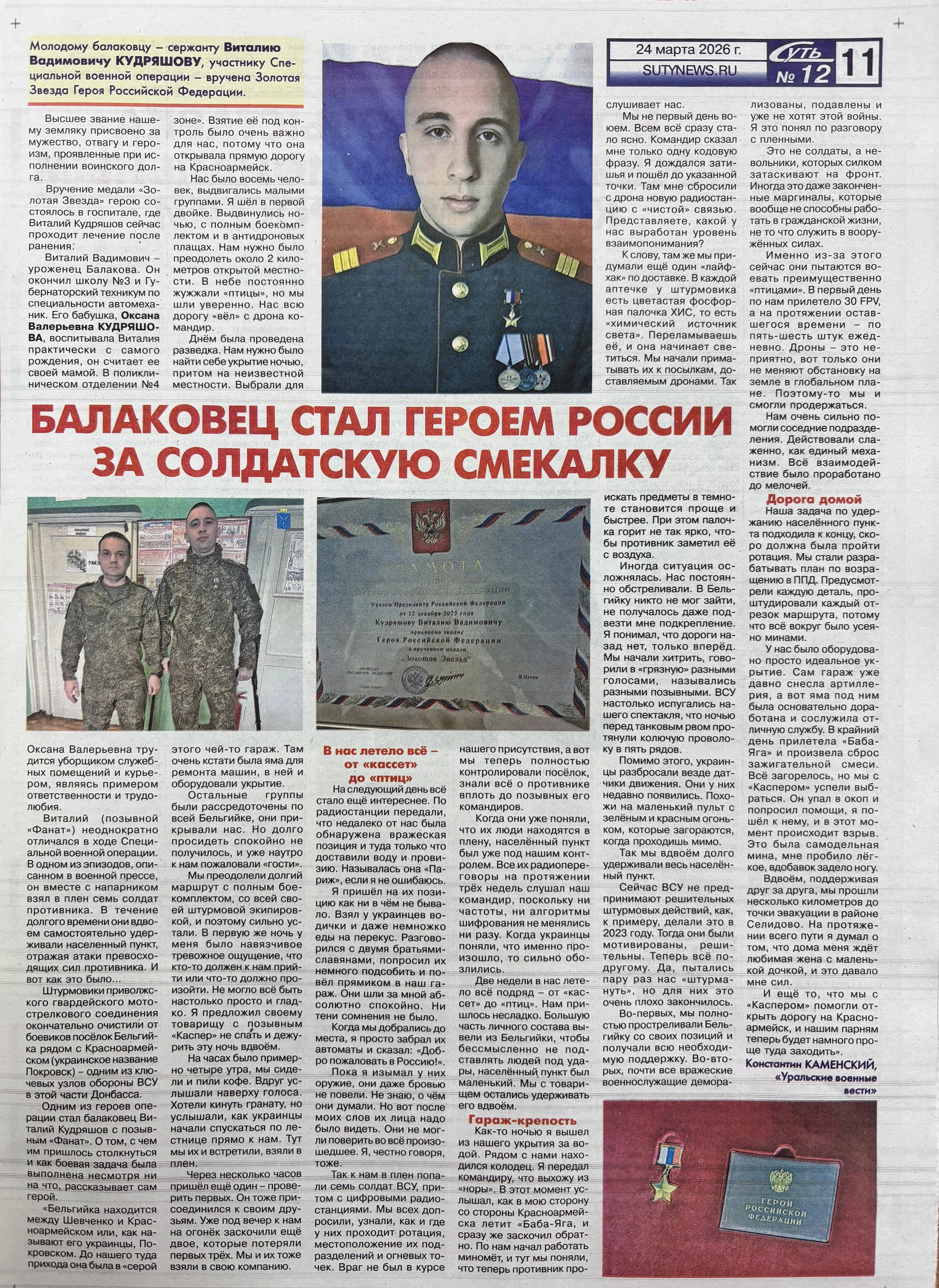 Вручение медали «Золотая звезда» герою состоялось в госпитале, где Виталий Кудряшов сейчас проходит лечение после ранения.