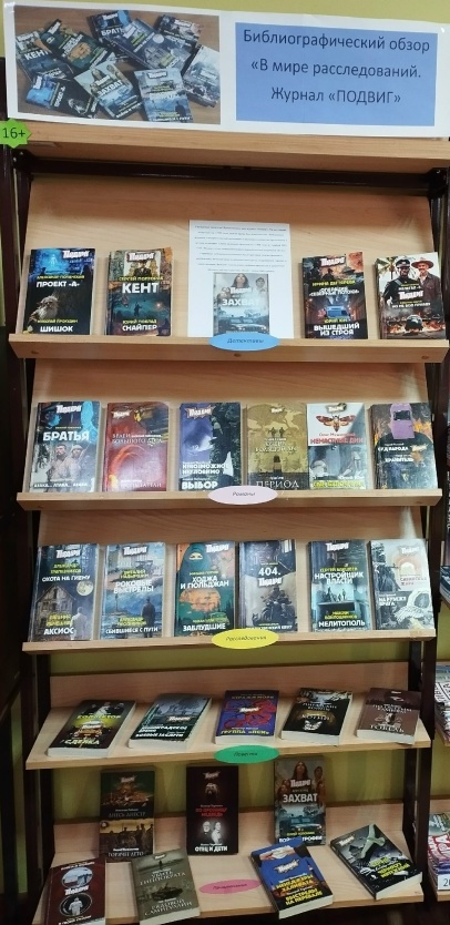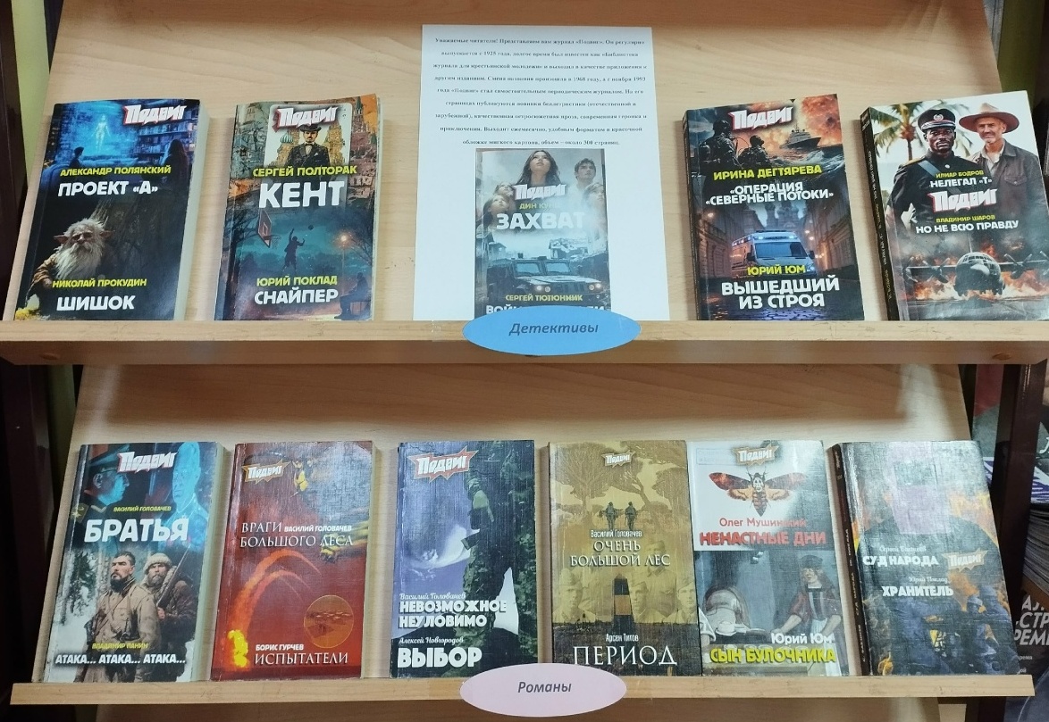 В городской центральной библиотеке проходит библиографический обзор журнала «Подвиг». Журнал регулярно выпускается с 1925 года, долгое время был известен как «Библиотека журнала для крестьянской молодежи» и выходил в качестве приложения к другим изданиям. Смена названия произошла в 1968 году, а с ноября 1993 года «Подвиг» стал самостоятельным периодическим журналом. На его страницах публикуются новинки беллетристики (отечественной и зарубежной), качественная остросюжетная проза, современная героика и приключения. Выходит ежемесячно, удобным форматом в красочной обложке мягкого картона, объем – около 300 страниц. В журнале печатаются такие авторы, как: Ирина Дегтярева, Алексей Новгородов, Василий Головачев и многие другие. Приглашаем за журналом «Подвиг» в нашу библиотеку.