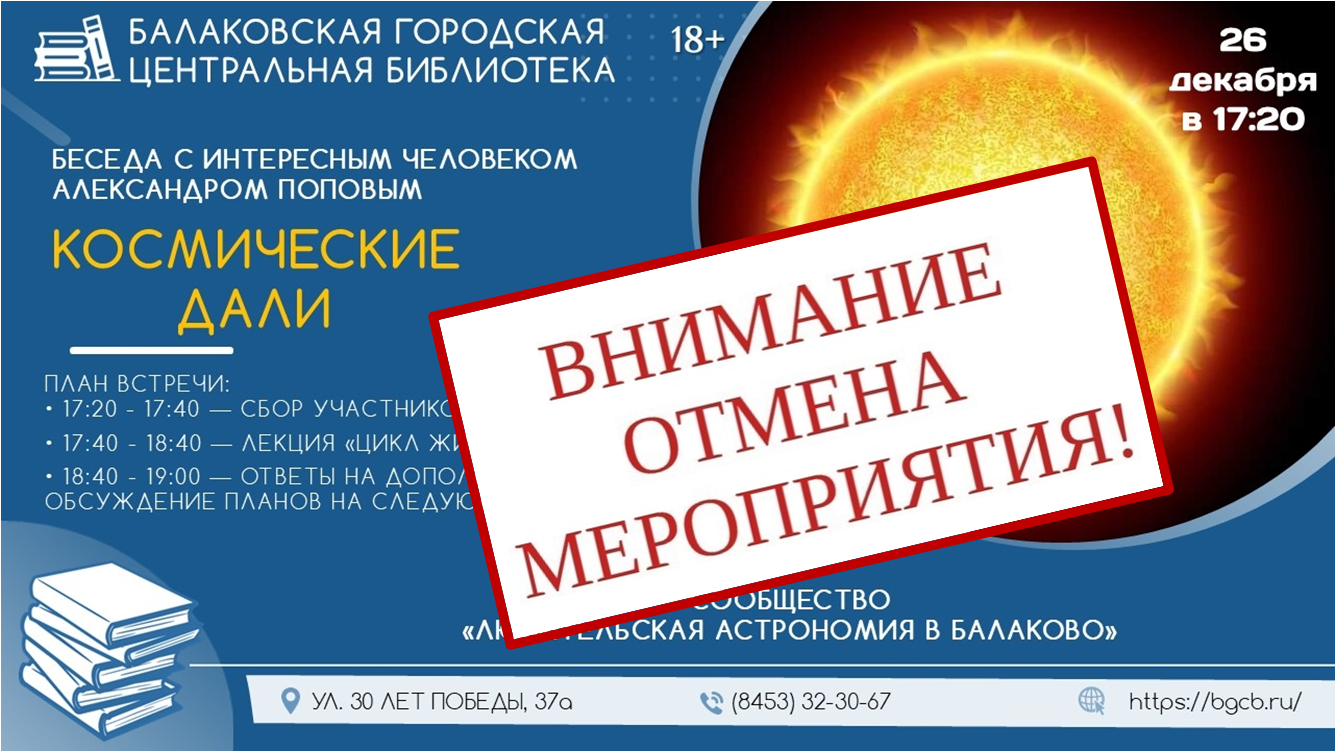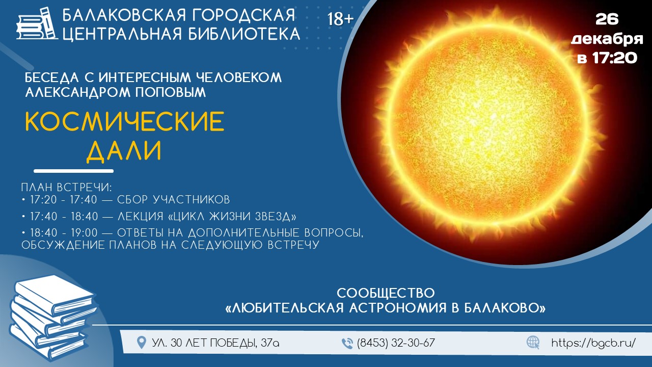 26 декабря с 17:20 до 19:00 в зале информации городской центральной библиотеки состоится встреча сообщества любителей астрономии.