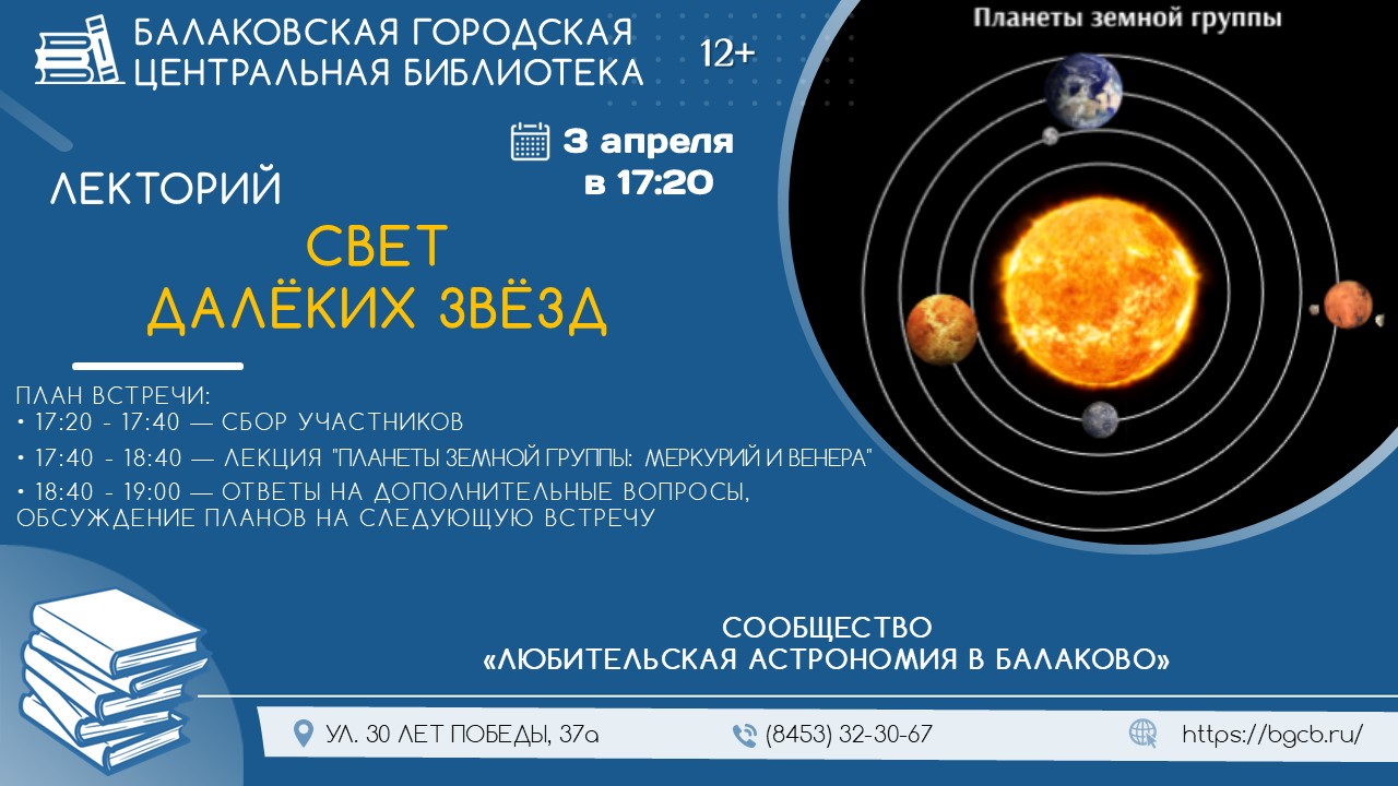 3 апреля с 17:20 до 19:00 в зале информации городской центральной библиотеки состоится встреча сообщества любителей астрономии.