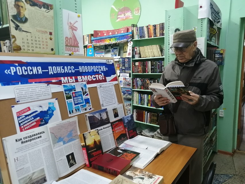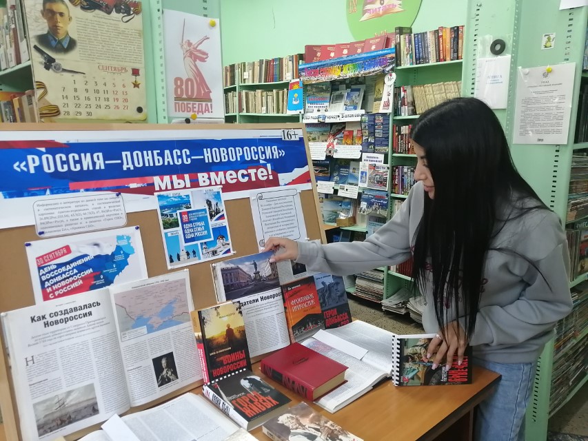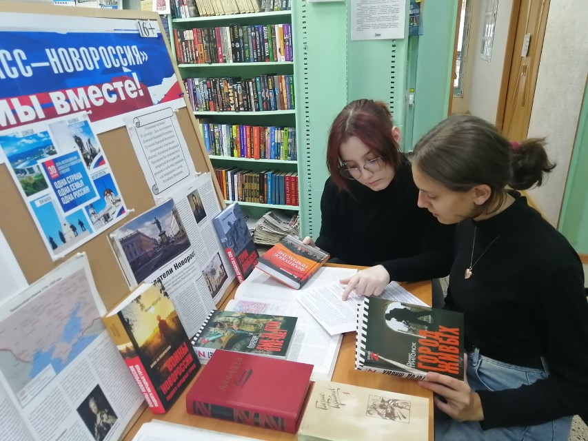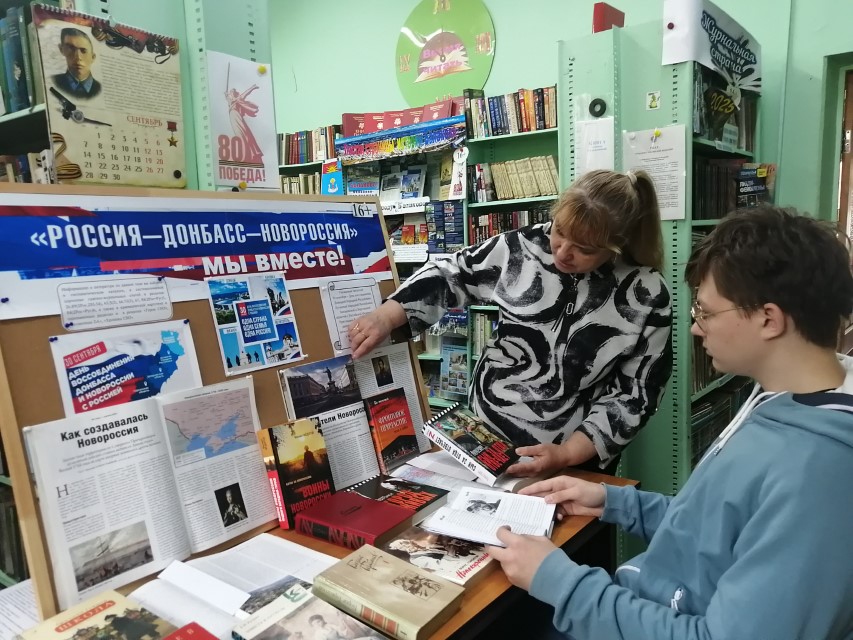 В честь воссоединения Донбасса и Новороссии с Россией библиотека провела информационное знакомство «Донбасс и Новороссия - мы вместе!». Читателей познакомили с литературой на выставке «Вместе мы едины». Были представлены сборники разных авторов, посвященные художественному осмыслению событий на Украине и Донбассе, материалы, рассказывающие о краткой истории этих регионов и о событиях, приведших к их возвращению в состав Российской Федерации. Выставка предоставляла посетителям сжатую, но информативную историческую справку о данном процессе. Активные пользователи приняли участие в викторине «Историческое воссоединение с Россией».