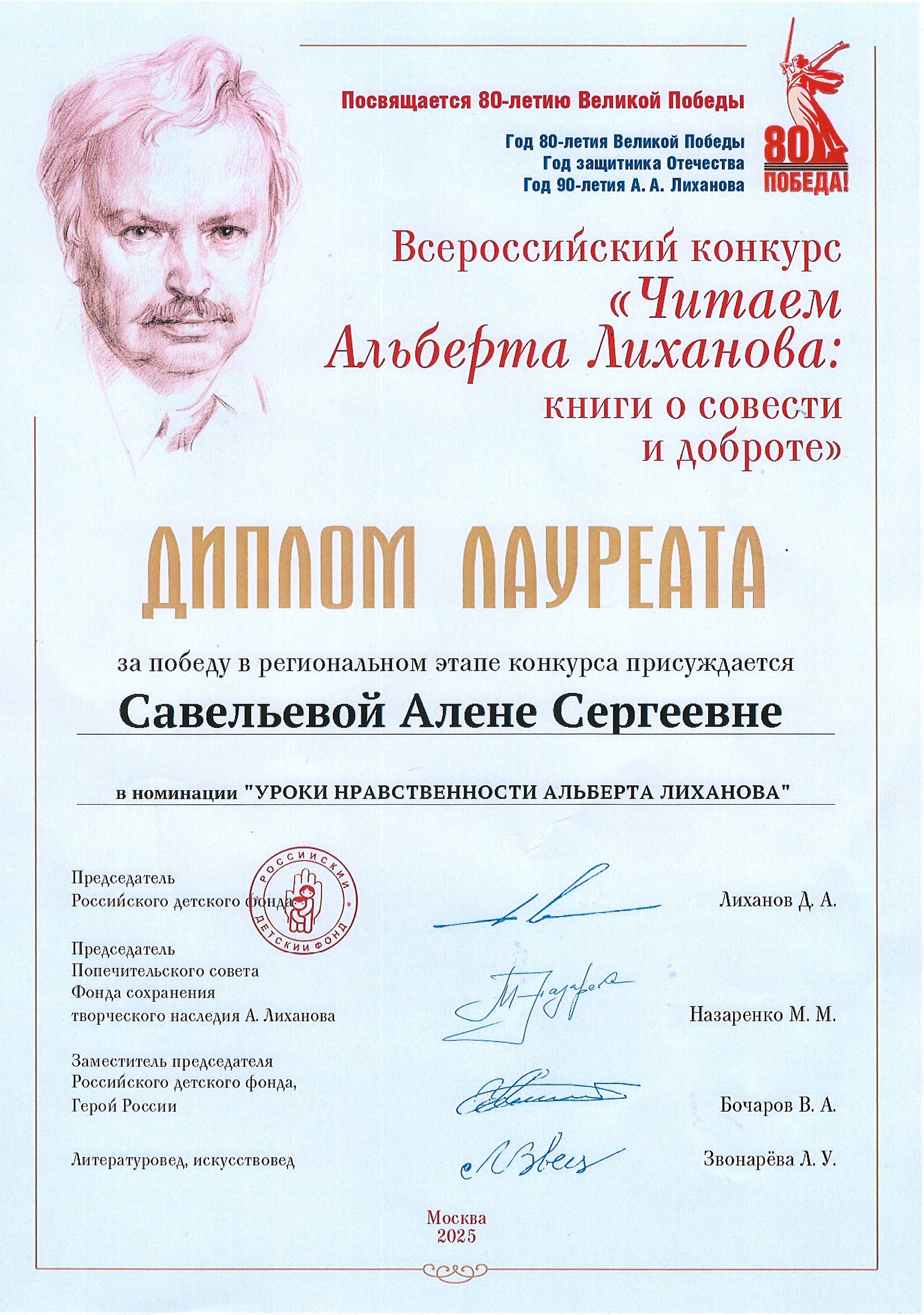 Библиотекарь городской центральной библиотеки Савельева Алена Сергеевна стала победителем среди участников Саратовской области во Всероссийском конкурсе «Читаем Альберта Лиханова: книги о совести и доброте», объявленном в 2025 году к 90-летию писателя и 80-летия Победы в Великой Отечественной войне. Конкурс организован Российским детским фондом, Фондом защиты детей и Фондом сохранения наследия Альберта Лиханова. Буктрейлер «Альберт Лиханов: детская библиотека» в номинации «Уроки нравственности Альберта Лиханова» был высоко оценен требовательным жюри. Библиотекарь Савельева А.С. награждена дипломом лауреата конкурса и ценным призом. Поздравляем Алену Сергеевну и желаем новых творческих успехов!