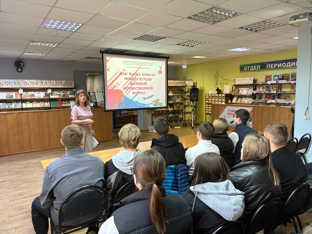 Об этом и не только шла речь на часе интересных сообщений «Наука ковала Победу» со студентами СГЮА, что прошёл 15 октября в городской центральной библиотеке. Елена Соколова, заведующий методическим отделом центральной библиотеки, рассказала ребятам, что труды советских ученых в годы Великой Отечественной войны, работавших по всем научным направлениям — от математики до медицины, помогли решить огромное число чрезвычайно трудных задач, необходимых фронту, и тем приблизили Победу. На слайдах презентации молодые люди познакомились с достижениями физиков, математиков, конструкторов, биологов, агрономов, открытия и разработки которых не только помогли победить фашистскую Германию, спасти сотни тысяч человеческих жизней, но и явились новым словом мировой научной мысли. В конце встречи сделали вывод, что вместе с солдатами в 1945 году победили рабочие, инженеры, медики и сугубо гражданские ученые. Знать и помнить их подвиг наш святой долг!