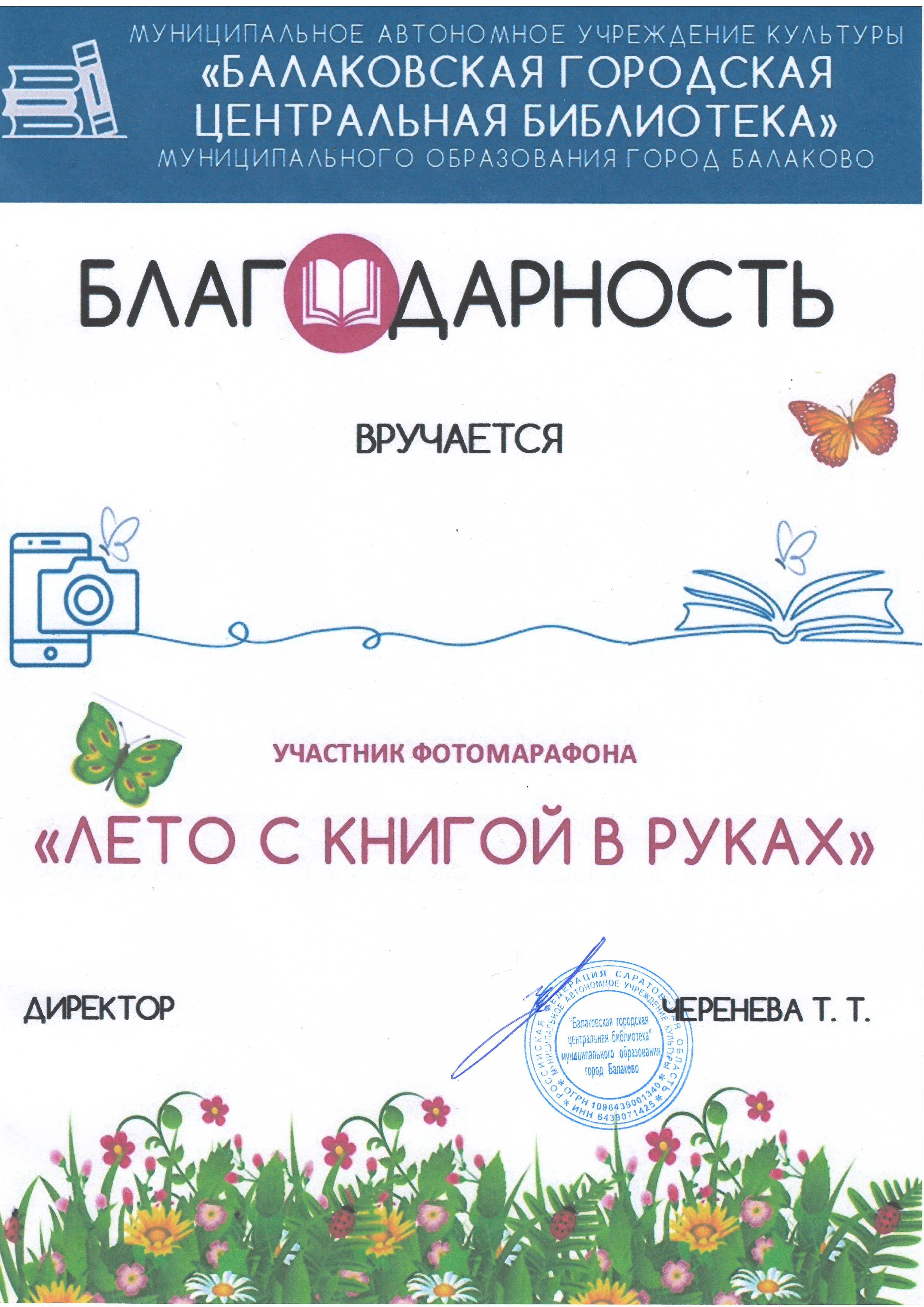 БЛАГОДАРНОСТЬ ЗА УЧАСТИЕ (СКАЧАТЬ) Поздравляем победителей! Все победители будут награждены дипломами и ценными призами. Свяжемся с вами для получения информации о том, как получить свой приз. Благодарим всех участников! Вы все проделали потрясающую работу, и мы надеемся, что фотомарафон "Лето с книгой в руках" вдохновил вас на новые творческие свершения и еще больше укрепил вашу любовь к чтению. Благодарность за участие в фотомарафоне будет направлена вам по электронной почте, указанной в заявке на участие. | |