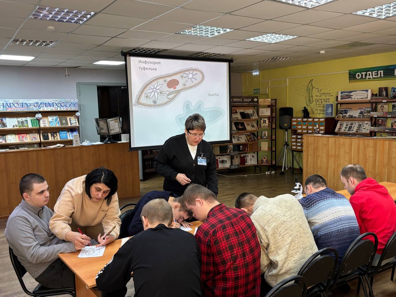 Библиотекари смогли открыть гостям невидимую глазу вселенную микромира, пробудить интерес к биологии и развить познавательную активность в доступной и увлекательной форме. Программа была составлена специально для гостей библиотеки. На слайдах демонстрировались фотографии различных предметов и растений под микроскопом. Был показан развивающий фильм с викториной. Затем последовало раскрашивание контурных изображений простейших организмов: инфузории–туфельки и амебы. Для раскрашивания использовались яркие карандаши и фломастеры, попутно библиотекарь рассказывала об особенностях строения этих организмов. Сочетание визуальной презентации и творческой деятельности позволило гостям мероприятия получить базовые представления о микроорганизмах и методах их изучения.