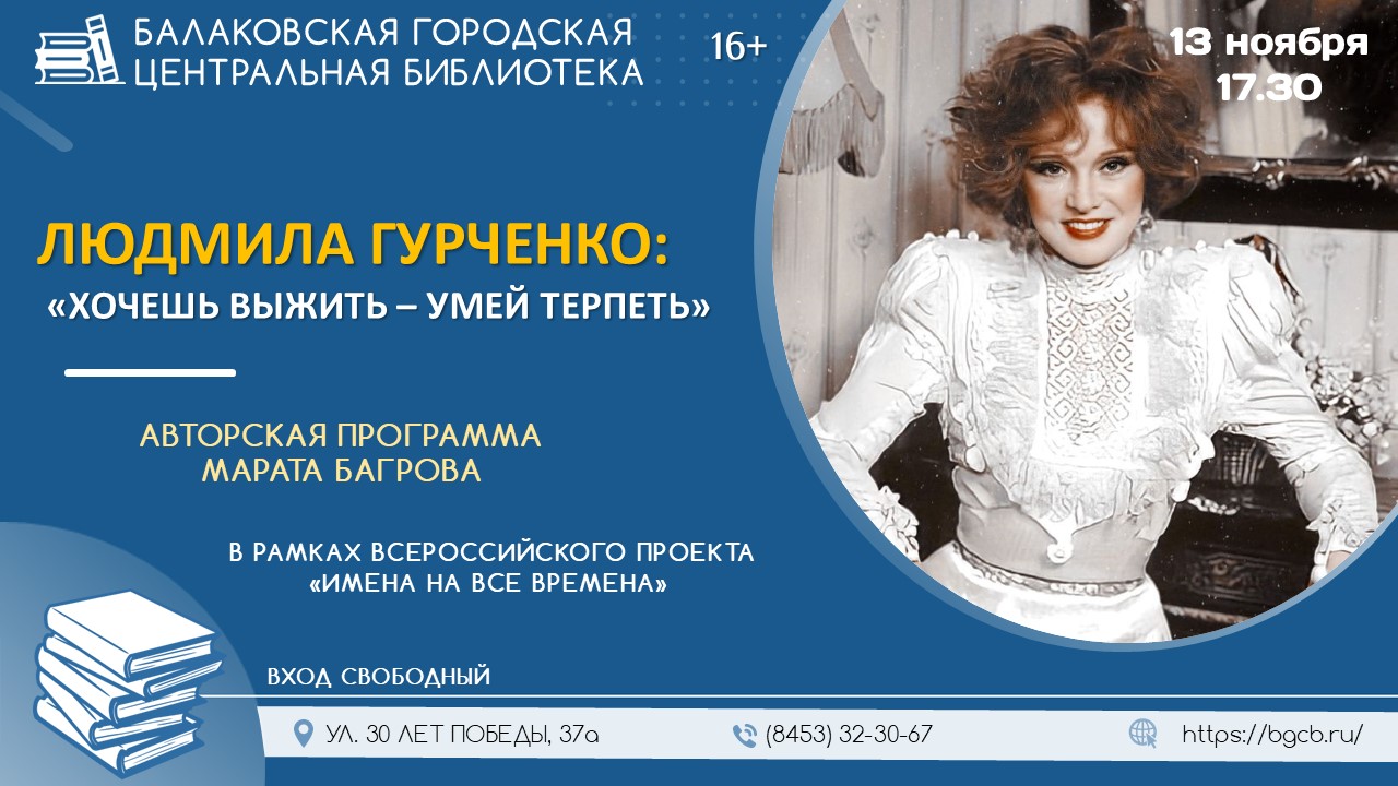 Людмила Гурченко – одна из самых ярких и разноплановых артисток советского и российского искусства, чьё творчество охватило кино, театр, эстраду, режиссуру и литературу. Её талант, харизма и трудолюбие сделали её одной из самых узнаваемых и любимых звёзд отечественной культуры. Творчеству Людмилы Марковны будет посвящена следующая авторская программа Марата Багрова в рамках проекта «Имена на все времена». На вечере гости увидят лучшие роли кинозвезды, услышат любимые песни в её исполнении. Для зрителей выступят балаковские артисты. Ждем вас по адресу 30 лет Победы, 37А. Телефон для справок: 32-34-76. Вход свободный. | |