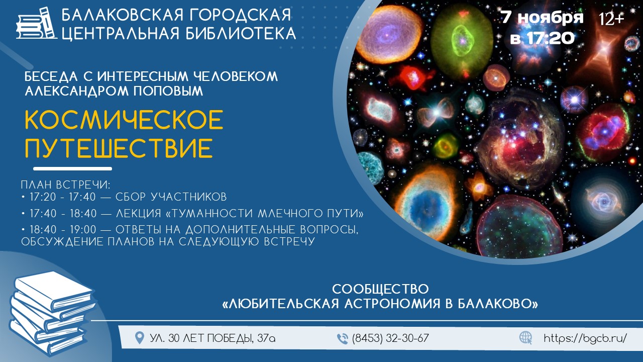 7 ноября с 17:20 до 19:00 в зале информации городской центральной библиотеки состоится очередная встреча сообщества любителей астрономии. В этот раз лектор Александр Попов расскажет про туманности, которые мы можем наблюдать в нашей галактике. Слушатели узнают из чего они состоят, как классифицируются, что является основной причиной их возникновения и как в них могут зарождаться новые звёзды. Также на встрече будет затронут вопрос о визуальном наблюдении этих "красочных" объектов в телескоп и о том, как правильно их фотографировать. Во время лекции можно будет задавать вопросы и дополнять ответы других участников. План встречи: • 17:20 - 17:40 — сбор участников. • 17:40 - 18:40 — лекция "Туманности Млечного пути" • 18:40 - 19:00 — ответы на дополнительные вопросы, обсуждение планов на следующую встречу. Ждем вас по адресу 30 лет Победы, 37А. Телефон для справок 32-34-75. Вход свободный. Более подробная информация о сообществе и встречах по ссылке: https://vk.com/club230869753 | |
