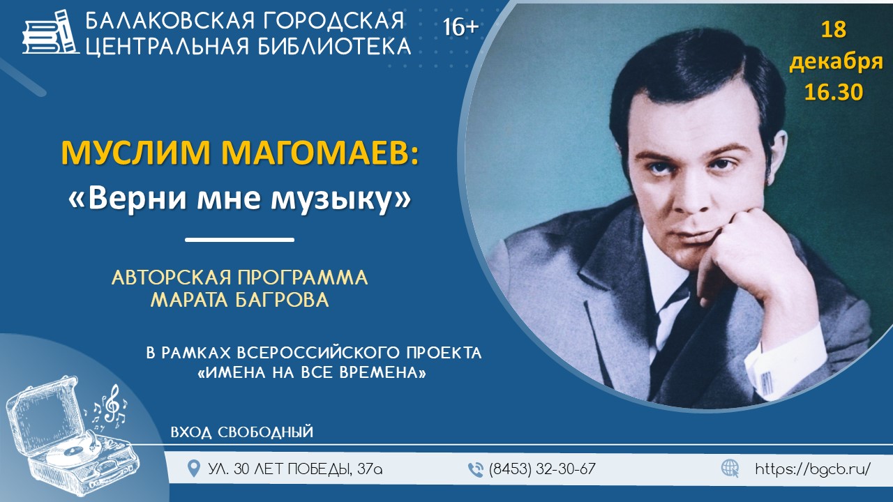 Муслим Магомаев остаётся эталоном вокального мастерства и артистизма. Его творчество — мост между классической и эстрадной традициями, а голос продолжает звучать как символ золотого века советской песни. Жизни и творчеству кумиру миллионов будет посвящена авторская программа Марата Багрова в рамках проекта «Имена на все времена». Ведущий приоткроет завесу тайны жизни артиста вне сцены, расскажет о творческом становлении. Рассказ ведущего будет сопровождаться показом видеофрагментов ярких выступлений певца. Ждем всех желающих 18 декабря в 16:30 в городской центральной библиотеке по адресу: ул. 30 лет Победы, д.37 А. Телефон: 32-34-76. | |