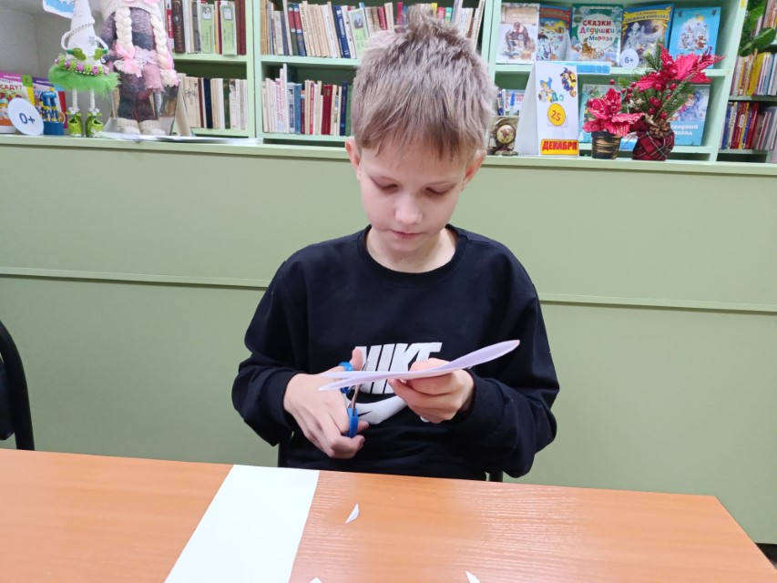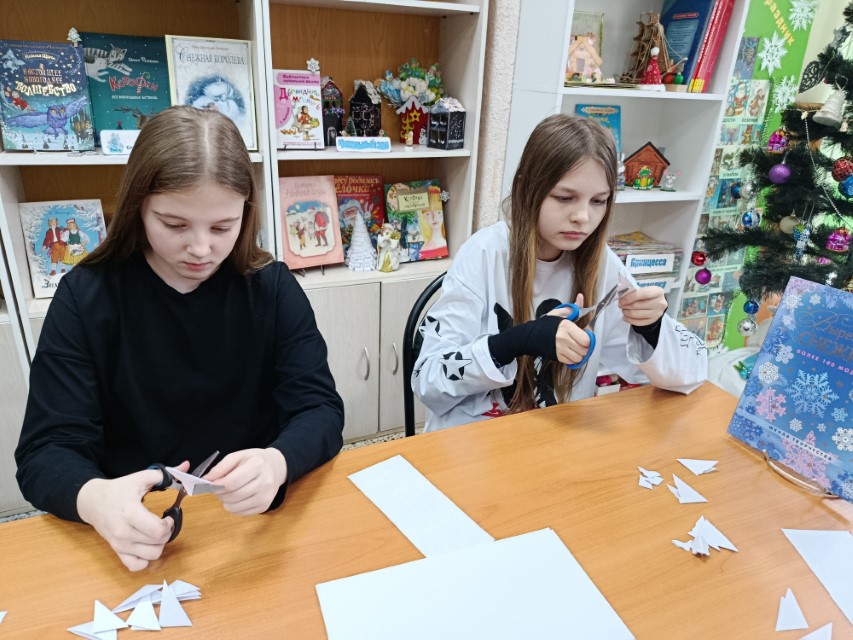 В преддверии новогодних праздников сотрудники библиотеки организовали для своих читателей творческую мастерскую «В Новый год мы не скучаем – клеим, лепим, вырезаем». На этом мероприятии участники смогли узнать о происхождении искусства вырезания снежинок из бумаги, а также познакомились с книгой В.В. Серова и В.Ю. Серова «Вырезаем снежинки». Ребята не только слушали интересные факты, но и получили возможность самостоятельно создавать удивительные узоры из обычной белой бумаги. Время прошло весело и увлекательно, оставив множество приятных впечатлений.