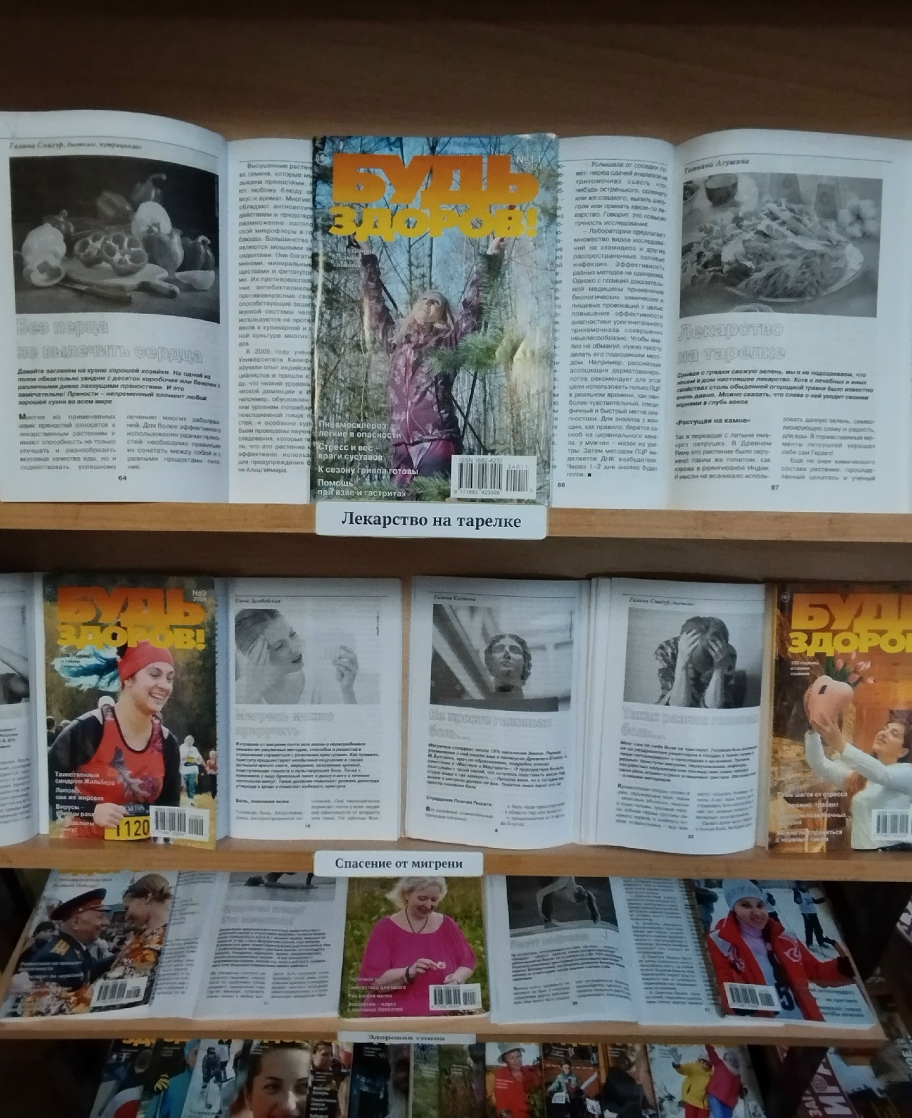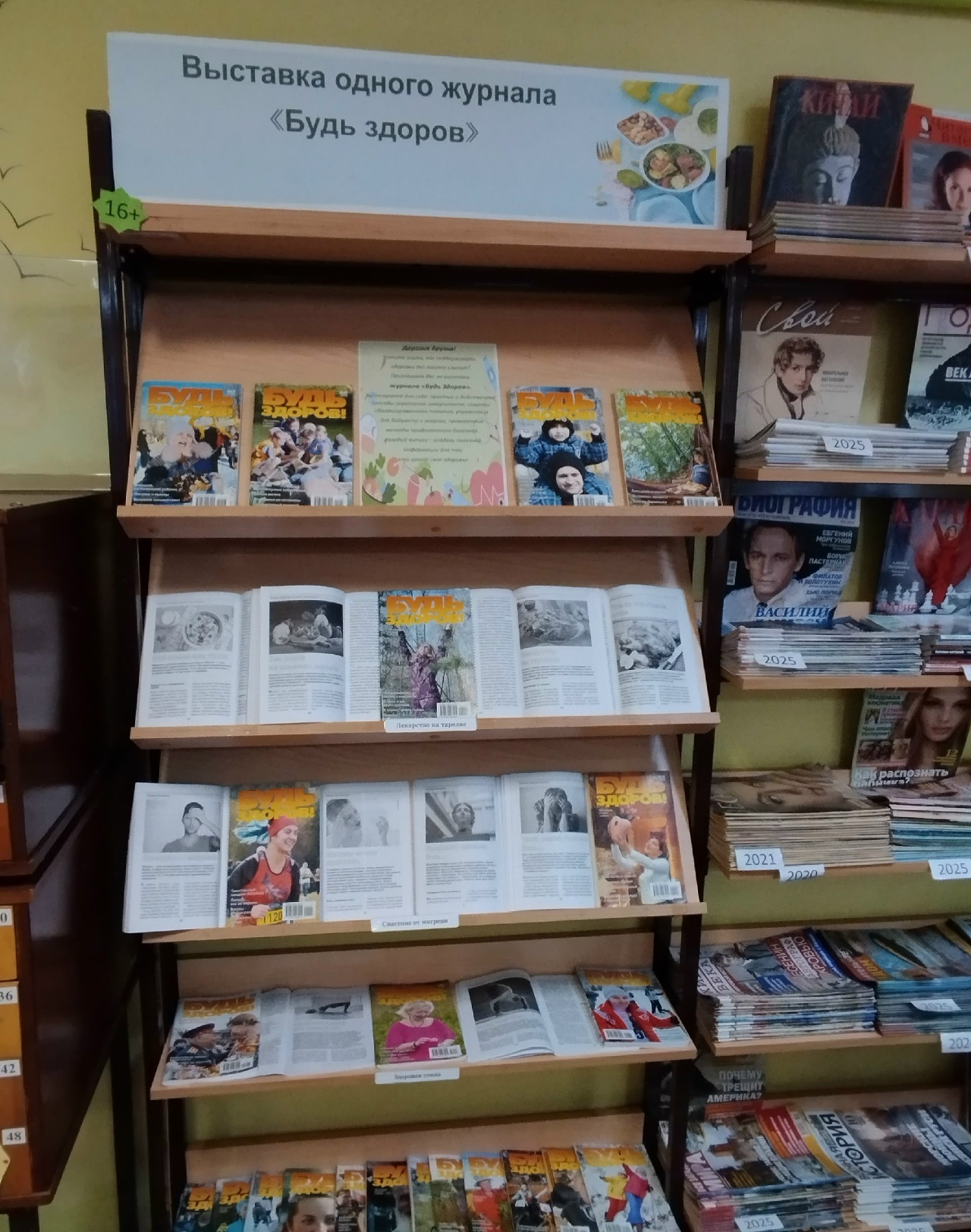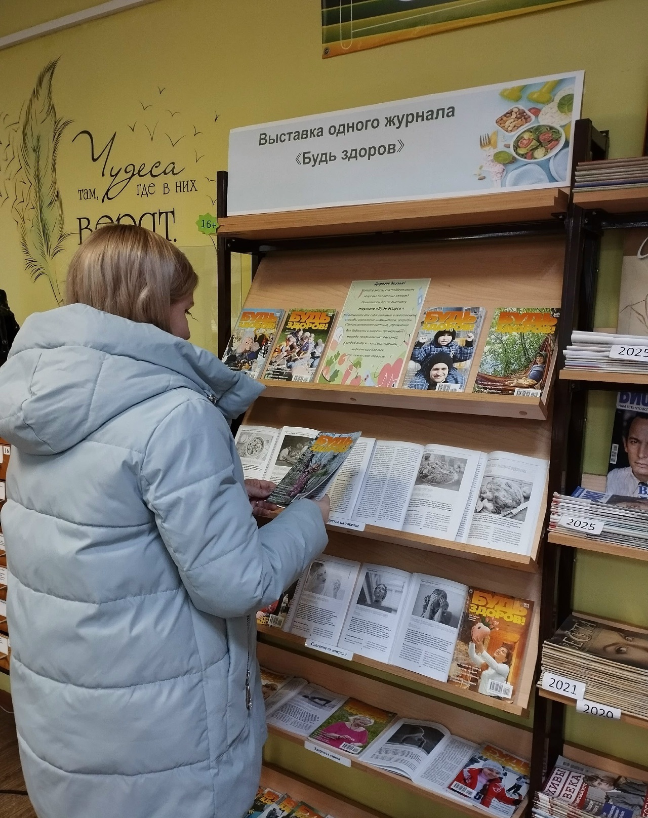 19 декабря в городской центральной библиотеке прошла выставка одного журнала «Будь здоров!». Журнал «Будь здоров» посвящён сохранению и укреплению здоровья, а также замедлению процессов старения и продлению активной жизни. Читатели смогли познакомиться с последними номерами журнала, в которых раскрыты следующие темы: особенности здорового питания; восстановление здоровья и рекомендации из традиционной и народной медицины; здоровые отношения. Журнал адресован всем, кто ценит здоровье во всех его проявлениях — физическом, нравственном, интеллектуальном.
