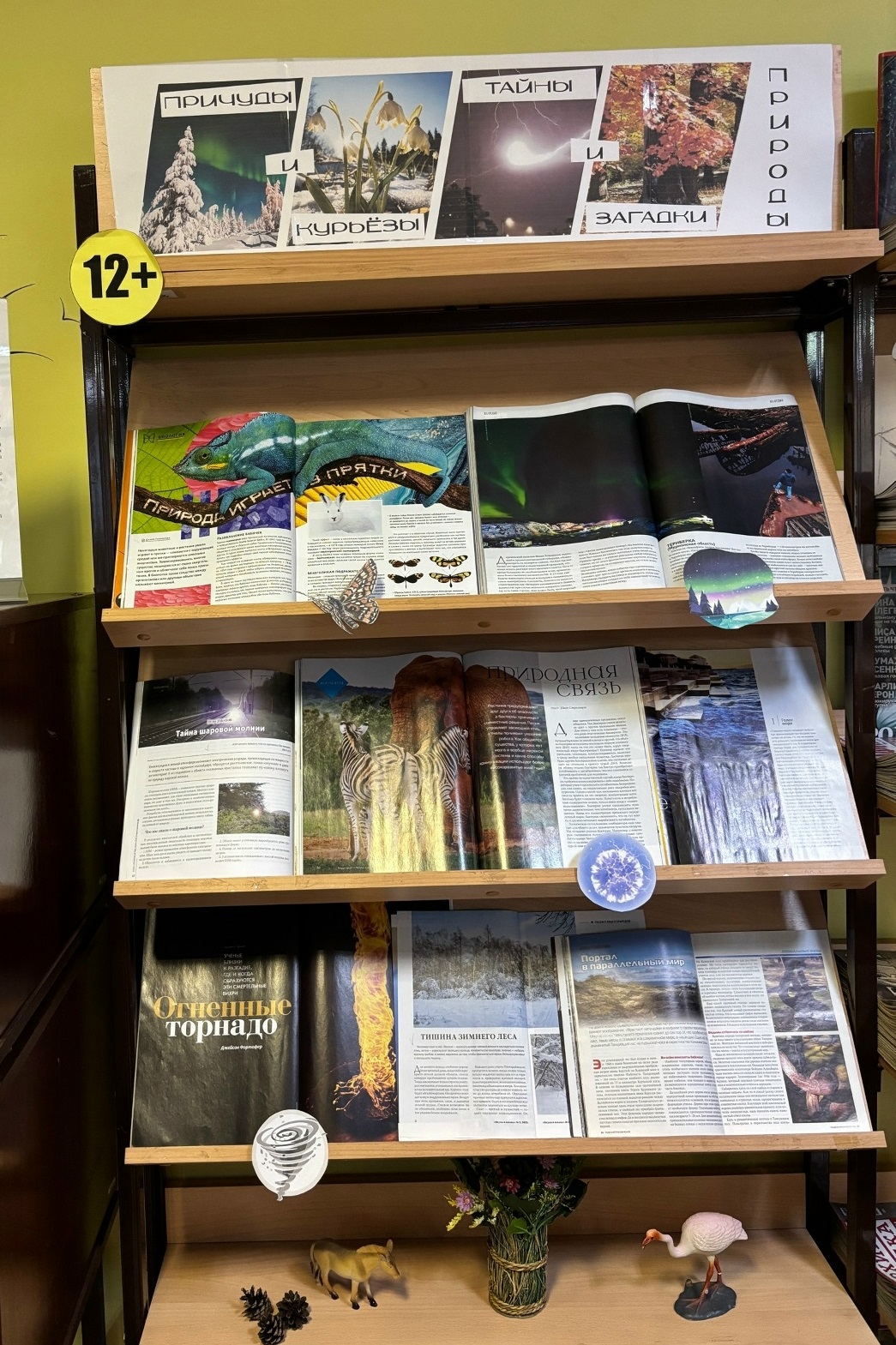 В читальном зале центральной библиотеки открылась выставка «Причуды и курьёзы, тайны и загадки природы». Приглашаем всех читателей погрузиться в таинственный и удивительный мир природы. Узнать о таких природных явлениях как: шаровая молния, полярное сияние, о прятках животных и растений, об огненных торнадо и даже о танцующем лесу! Эти и многие другие загадки природы напоминают нам о том, что Земля полна тайн, которые вдохновляют на дальнейшие исследования, ведь каждый новый ответ может открыть дверь к ещё большим вопросам. Несмотря на развитие науки и технологий, остаются явления, которые бросают вызов пониманию и продолжают удивлять даже опытных исследователей.