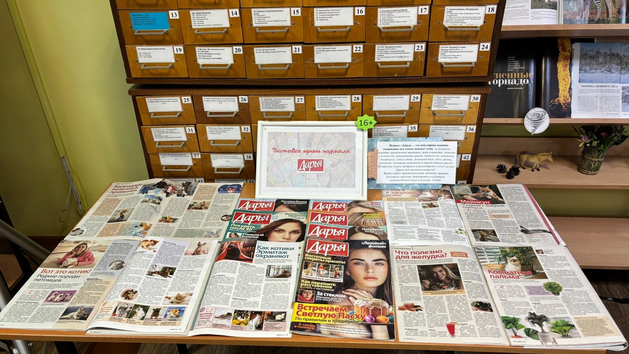 В читальном зале городской центральной библиотеки для читателей и гостей открыта выставка в течение дня журнала «Дарья». Это популярное издание, содержащее все самые важные темы: кулинарные рецепты, праздничные традиции, мода и красота, здоровье и психология, рекомендации врачей, диетологов, садоводов, дизайнеров, семья и дети, домашний быт, дача, цветы, рукоделие, домашние животные, и многое-многое другое. Журнал имеет просветительское значение, призван расширять кругозор, формировать и развивать художественный вкус и культуру чтения.
